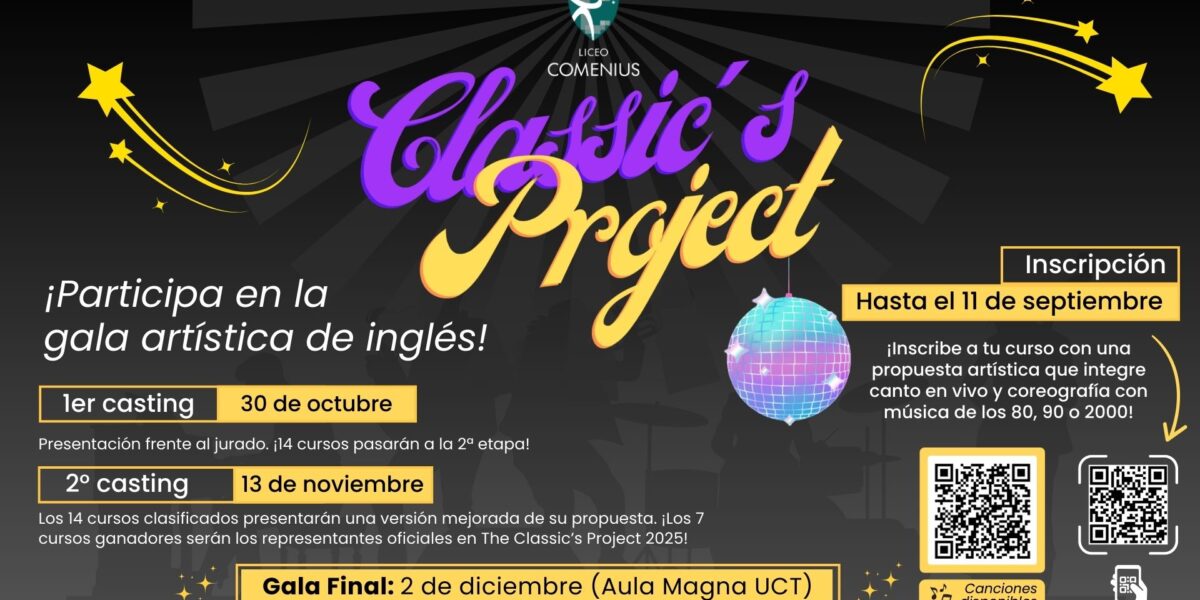 El Liceo Jan Comenius invita a todos sus cursos a participar en una nueva edición de laGala de Inglés “The Classic’s Project”, un evento que celebra la música, el talento y la creatividad de nuestros estudiantes y que se retoma después de la pandemia.